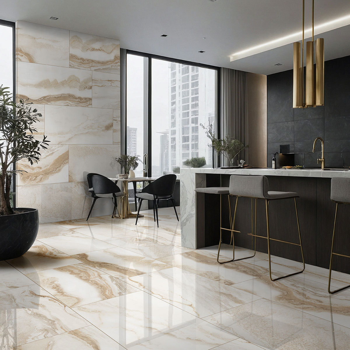 Experience the enduring grace of Nebula Almond as it envelops your space. Fashioned from premium porcelain, this 24” x 48” large-format tile radiates sophistication with its polished finish. Echoing the allure of desert dunes adorned with coffee-toned hues against creamy white, it embodies the essence of Skyline White marble's distinctive charm. With its mesmerizing design featuring long blurred veins in perpetual motion, it infuses any setting with a dynamic energy. Whether gracing floors or walls, Nebula Almond transforms interiors with its captivating aesthetic, evoking the luxurious ambiance of nature's awe-inspiring landscapes.