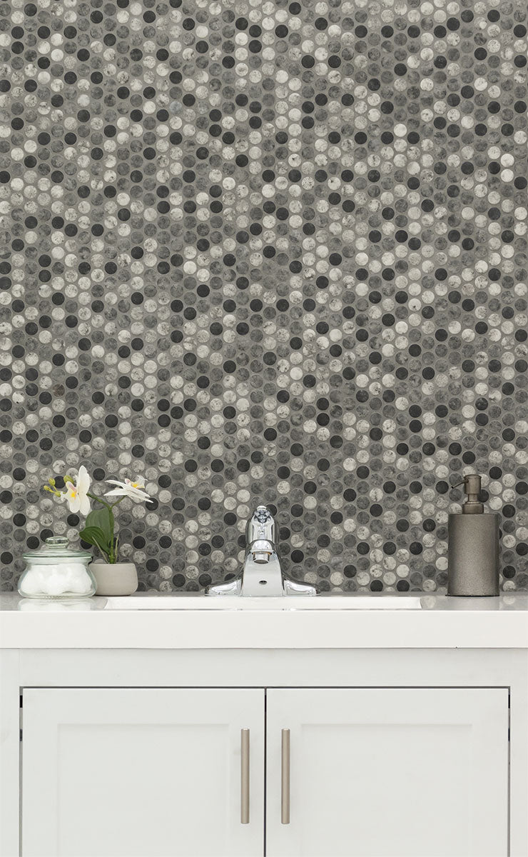 Made from recycled glass, Urban Tapestry Penny Round tile features a variety of neutral dark gray tones, making it the perfect balance for traditional and contemporary decor styles. These glass mosaic tiles are both durable and low-maintenance, making it ideal for use in residential and light commercial spaces. Install these appealing penny rounds to add a touch of visual interest to any area where it’s used, such as on kitchen backsplashes, countertops, accent walls, shower walls, or in nooks. Additionally, this tile is Greenguard Indoor Air Quality Certified® and is mounted on mesh-backed sheets for easy installation and a professional finish.
